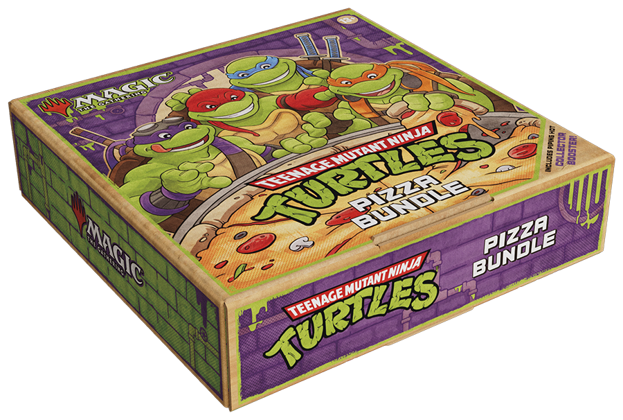 Calling all TMNT and Magic fans: Any way you slice it, this hot and fresh bundle really delivers! Once you open the lid, you'll be greeted with nine Turtle-tastic Play Booster packs, 25 basic lands, an oversized Spindown™, full-art pizza basic lands, and pizza-themed promo cards of classic Magic spells. Don't forget the cherry (tomato) on top—a Collector Booster stuffed with rares and foils!