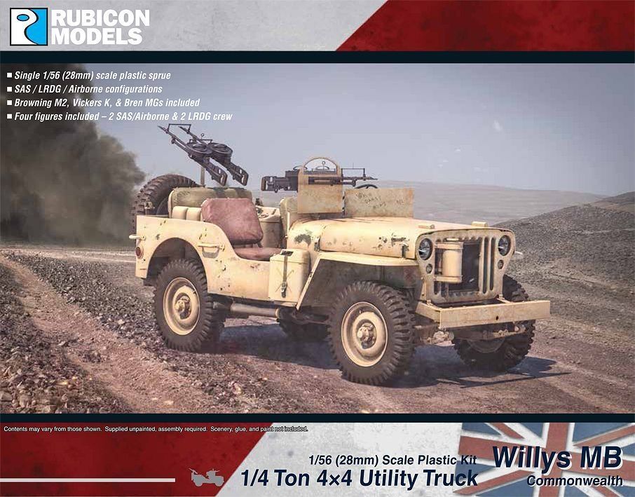 This is the version of the Jeep used by Commonwealth forces such as the LRDG, SAS and Airborne. The Willys MB (commonly known as a Jeep or jeep, formally as the US Army Truck, ¼ ton, 4x4) is a four-wheel drive utility vehicle that was manufactured during WW2. It is also one of the first military vehicles mass-produced in the US. It is the culmination of war-time ingenuity, standardization and strategic personalization for transport of personnel and cargo. Soon to become the ubiquitous, “world-famous” jeep, the Willys MB and Ford GPW models were very effective on the ground, with many standardized features such as 6.00x16 tires, 60 horsepower at 4,000 rpm, a gasoline can bracket on the left rear, provisions for trailer lights, spark interference suppression, a blackout light system, twin top bows and sealed spring shackles. During WW2, Ford produced some 280,000 of these vehicles. A total of 361,339 (between Nov 18, 41 and Sep 21, 45) were build.