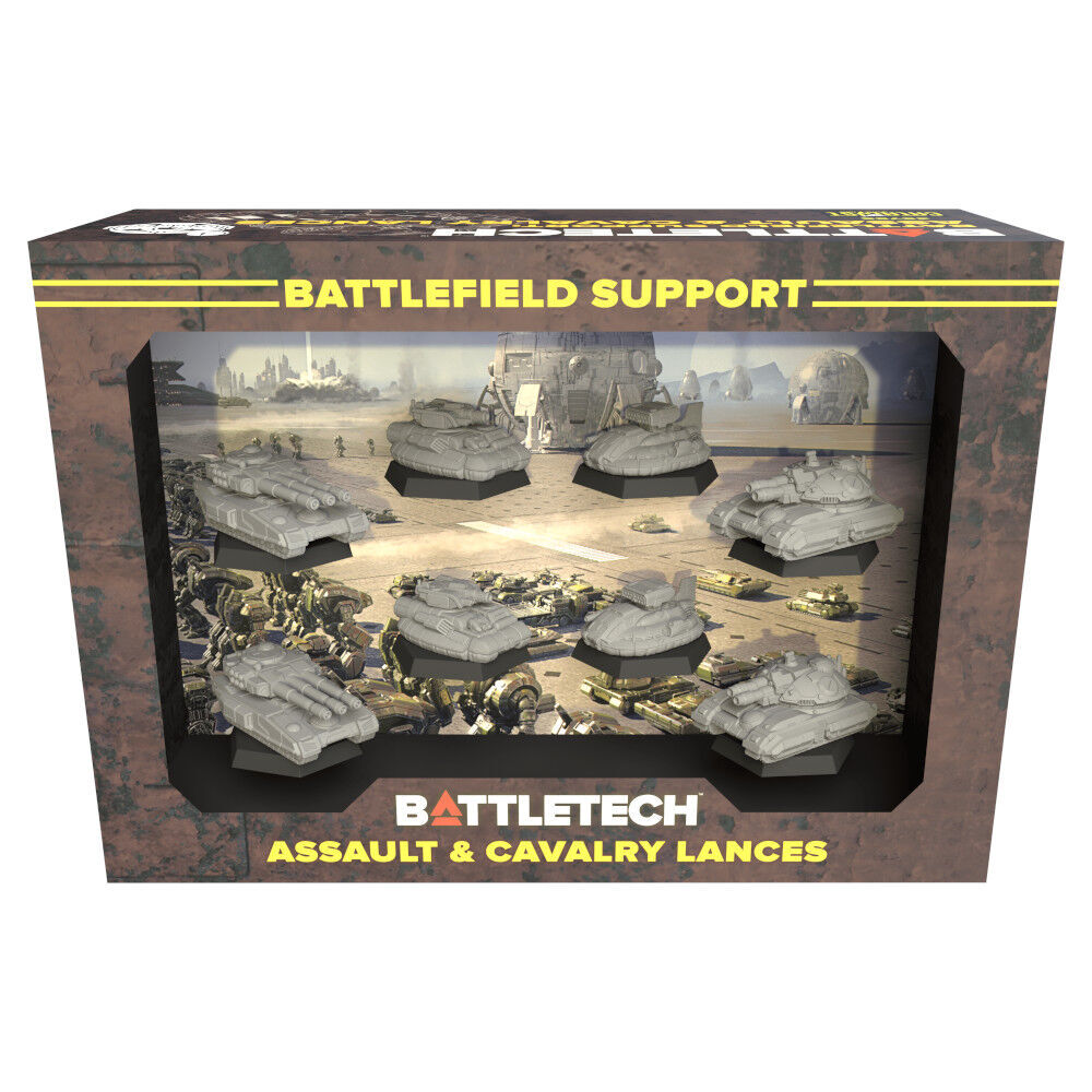 The BattleTech Battlefield Support: Assault & Cavalry Lances is a collection of eight plastic miniatures for use in the classic BattleTech tabletop and Alpha Strike games. The box also provides eight dry-erase cards, which are intended to directly support Alpha Strike gameplay, and eight battlefield support Cards.