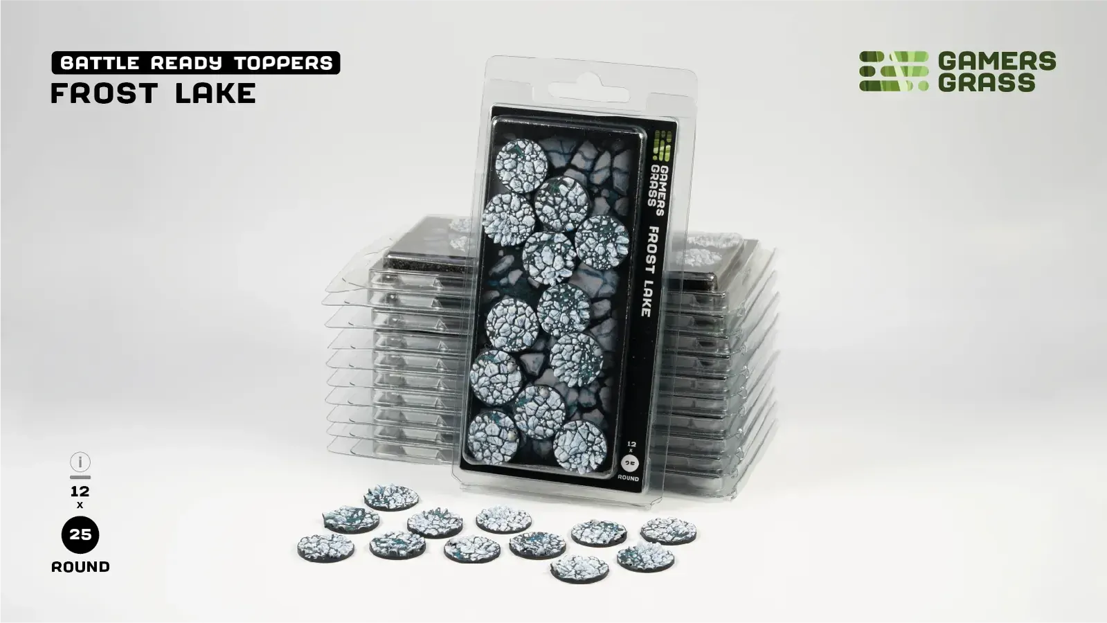 This blister contains 12 thermoplastic toppers made for 25mm round bases, in a Frost Lake theme.