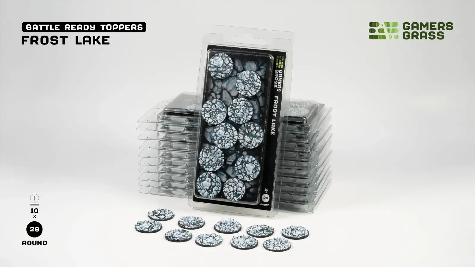 A shallow frozen lake where the ice is slowly melting away, crumbling and drifting over icy waters. Explore the northern ice-lands of your fantasy worlds, or an ice-covered planet in the far rim of the galaxy, with the “Frost Lake” theme. These toppers are ideal for basing your miniatures effortlessly, bringing your miniature heroes into perilous quests and bone-chilling scenarios. Spice up your tabletop wargames in just one step!