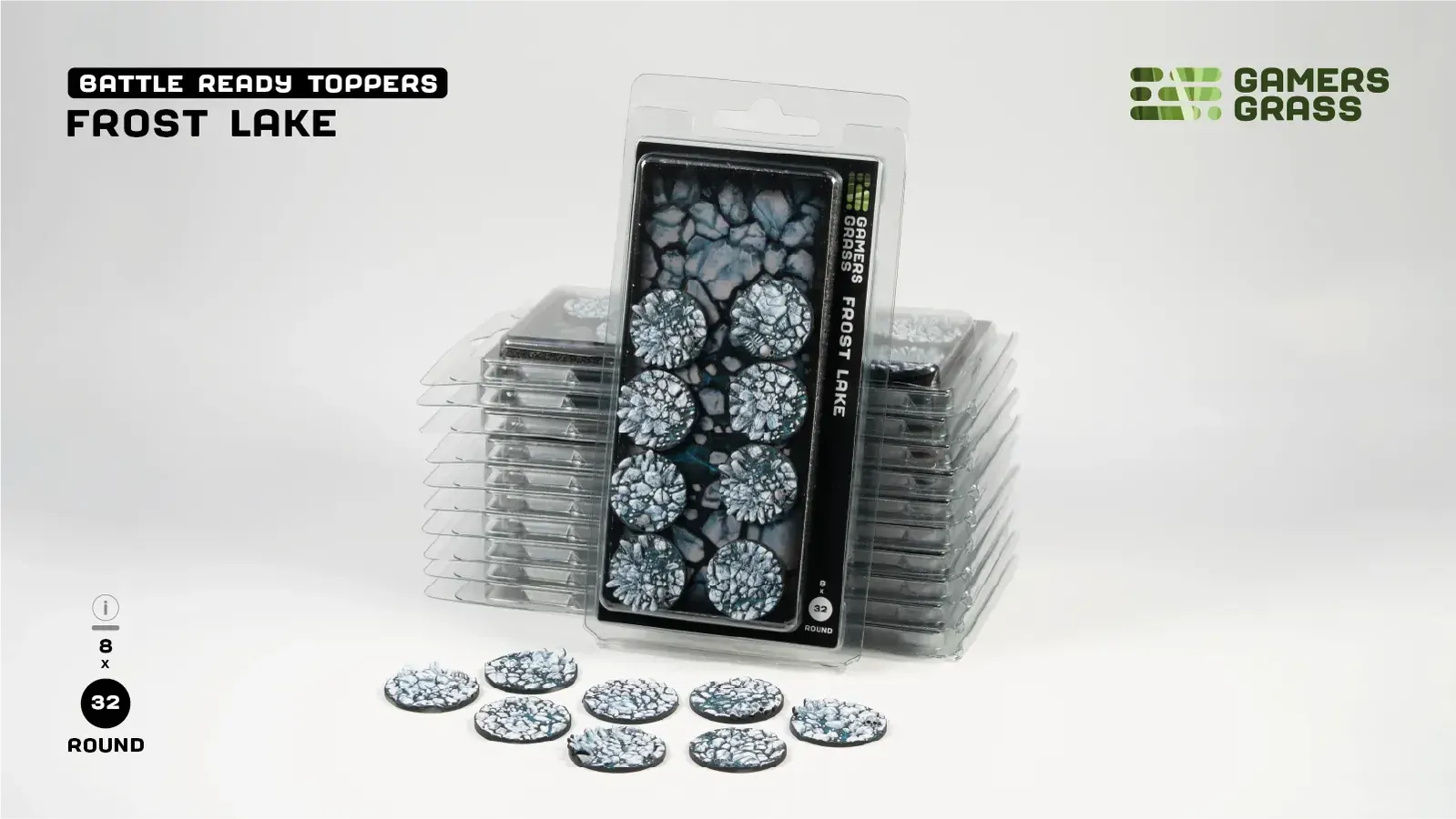 This blister contains 8 thermoplastic toppers made for 32mm round bases, in a Frost Lake theme.