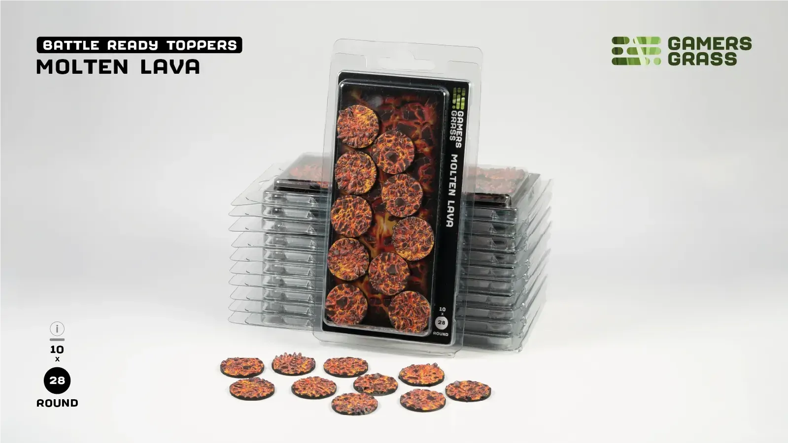 This blister contains 10 thermoplastic toppers made for 28mm round bases, in a Molten Lava theme.